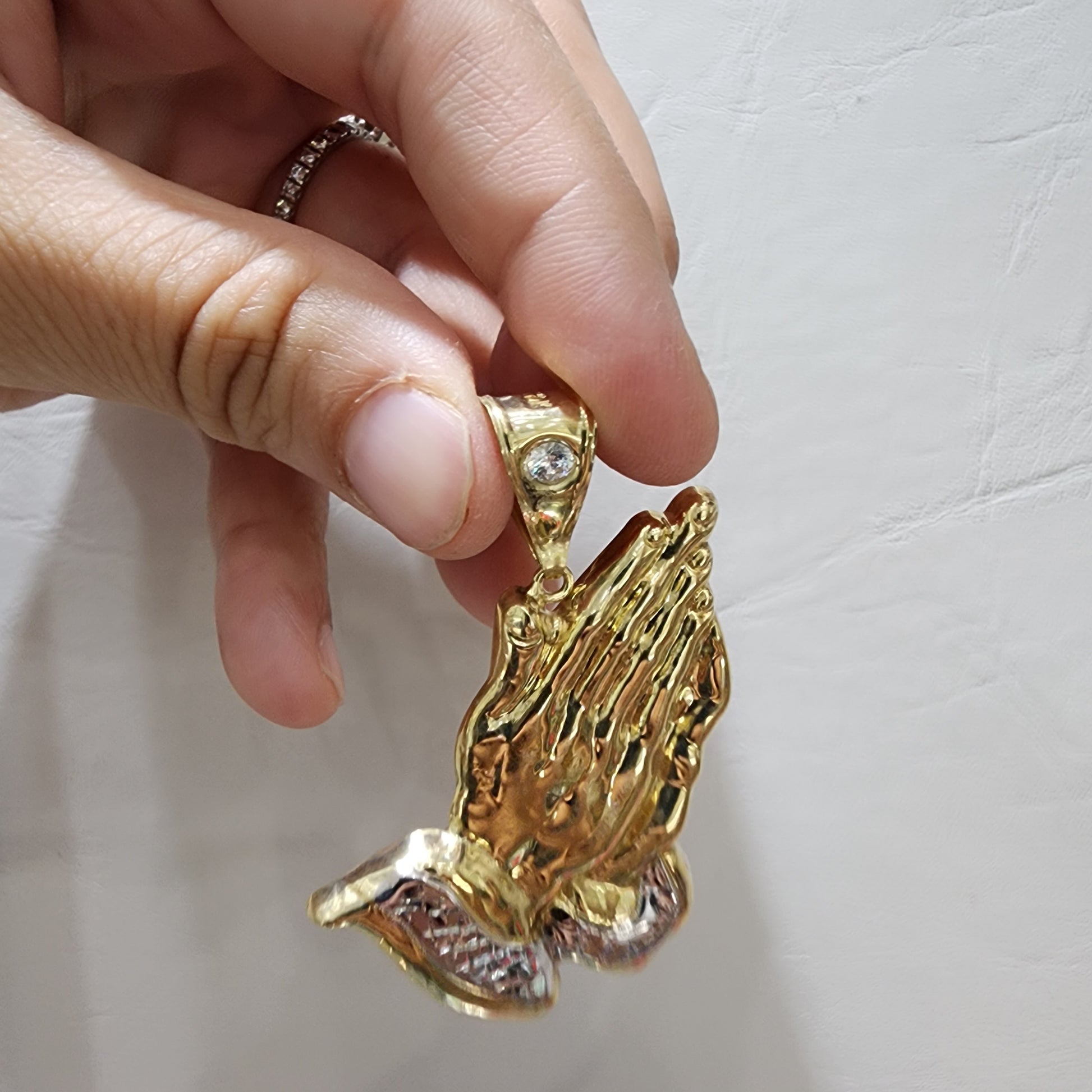 Colgante de mano de oración de dos tonos de oro de 10 quilates